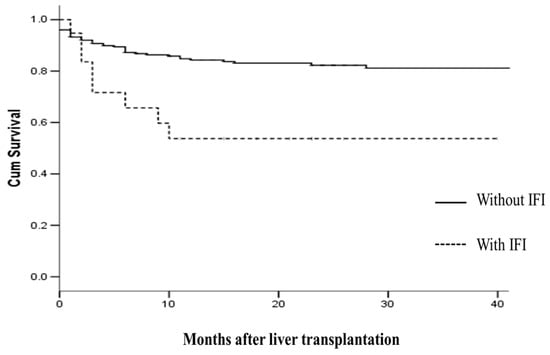 The median ICU and hospital stays after LT were 7.9 ± 9.8 and 33.8 ± 28.2 days, respectively. The median follow-up period was 20 months, and no patient was lost to follow-up. Notwithstanding the difficulty of assessing the primary cause of death in these recipients, which was sepsis/multi-organ failure in 73% of cases, no deaths appeared directly to be due to IFI. Patient survival rates at six months and one year after LT were 87% and 83.4%, and graft survival rates were 85% and 81.6%, respectively. Recipients with IFIs had significantly lower patient survival rates at six months and one year when compared to recipients with no IFI (89.3% vs. 68.9%; p = 0.007 at six months, and 85.3% vs. 57.9%; p = 0.002 at one year, respectively). Finally, Kaplan Meier curves were fitted for the two groups of patients according to the IFI experienced, and compared using the log-rank test (Figure 1).