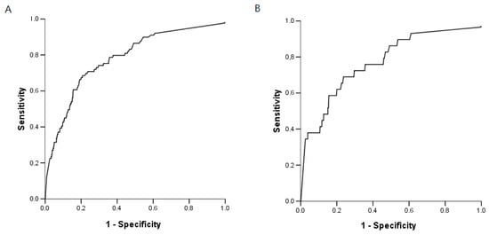 Receiver operating characteristic (ROC) curves were used to evaluate the potential for BG to diagnose IFI (Figure 2). The area under the ROC curves was 0.78 (95% CI: 0.73–0.83). The sensitivity, specificity, positive predictive value (PPV) and negative predictive value (NPV) of BG for IFI, overall, were 75% (95% CI: 65–83), 65% (95% CI: 62–68), 17% (95% CI: 13–21), and 96% (95% CI: 94–97), respectively. If IC and IPA were considered separately, the same results in terms of AUROC (area under receiver operating characteristic) were observed: the AUROC value was 0.77 (5% CI: 0.67–0.86) for the diagnosis of IPA and 0.78 (95% CI: 0.72–0.84) for the diagnosis of IC (Figure 2).