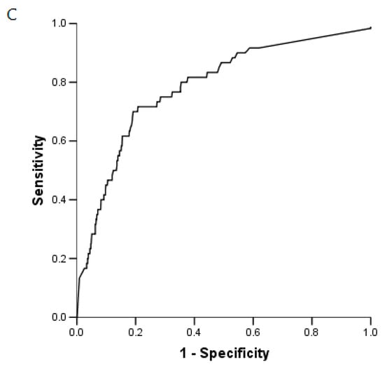 Receiver operating characteristic (ROC) curves used to evaluate the ability of BG to diagnose (A) an invasive fungal infection (IFI): AUROC (Area under ROC) value of 0.78 (95% confidence interval (CI): 0.73–0.83); (B) Invasive pulmonary aspergillosis (IPA): AUROC value 0.77 (95% CI: 0.67–0.86); and (C) invasive candidiasis (IC): AUROC value 0.78 (95% CI: 0.72–0.84).