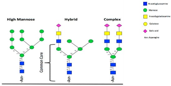 - Varki, A.; Cummings, R.D.; Esko, J.D.; Freeze, H.H.; Stanley, P.; Bertozzi, C.R.; Hart, G.W.; Etzler, M.E.; Stanley, P.; Cummings, R.D. Structures common to different glycans. In Essentials of Glycobiology, 2nd ed.; Cold Spring Harbor Laboratory Press: New York, NY, USA, 2009. [Google Scholar]