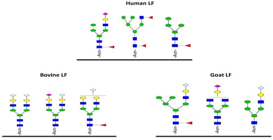 - Le Parc, A.; Dallas, D.C.; Duaut, S.; Leonil, J.; Martin, P.; Barile, D. Characterization of goat milk lactoferrin N-glycans and comparison with the N-glycomes of human and bovine milk. Electrophoresis 2014, 35, 1560–1570. [Google Scholar] [CrossRef] [PubMed]
