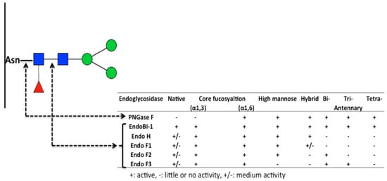 - Altmann, F.; Schweiszer, S.; Weber, C. Kinetic comparison of peptide: N-glycosidases f and a reveals several differences in substrate specificity. Glycoconj. J. 1995, 12, 84–93. [Google Scholar] [CrossRef] [PubMed]