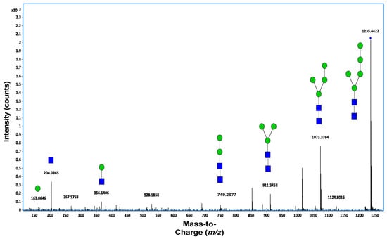 - Coddeville, B.; Strecker, G.; Wieruszeski, J.-M.; Vliegenthart, J.F.; van Halbeek, H.; Peter-Katalinić, J.; Egge, H.; Spik, G. Heterogeneity of bovine lactotransferrin glycans. Characterization of α-d-galp-(1→3)-β-d-gal-and α-neuac-(2→6)-β-d-galpnac-(1→4)-β-d-glcnac-substituted N-linked glycans. Carbohydr. Res. 1992, 236, 145–164. [Google Scholar] [CrossRef]