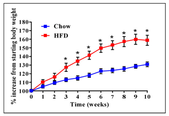 High fat diet (HFD) induced obesity in mice before small interfering RNA (siRNA) administration. n = 9 mice/group, * p < 0.05.