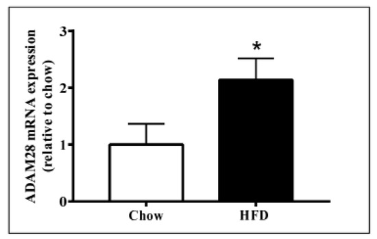 2.1. ADAM28 mRNA Expression Is Significantly Elevated in the Liver of High Fat Diet Fed Mice