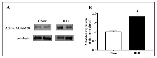 ADAM28 mRNA and protein expression in the liver was studied, as the liver is an organ well known for lipid and glucose metabolism [11]. We demonstrated that ADAM28 mRNA levels are increased in the livers of mice fed a high fat diet for 12 weeks (Figure 2). In addition, active ADAM28 (42 kDa) protein levels were also increased in the livers of mice fed a high fat diet, as evidenced by western blotting (Figure 3).