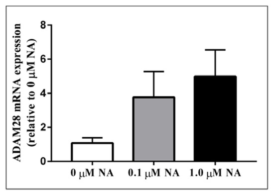 Activation of the sympathetic nervous system (SNS) is a cardinal feature of obesity, metabolic syndrome, and type 2 diabetes (T2DM) and is associated with disease progression [12]. In order to test our hypothesis that sympathetic nervous system activation may result in elevated ADAM28 expression, we treated human THP-1 monocytes with noradrenaline (NA), the main neurotransmitter of the SNS. Excitingly, we have now shown for the first time that NA treatment may result in elevated ADAM28 expression in a dose-dependent manner (Figure 4). The difference between 0 and 1.0 µM NA treatment groups was close to reaching significance (p = 0.0698).