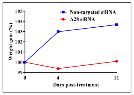 In vivo knock-down of mouse ADAM28 reduces high fat diet-induced mean weight gain. (n = 3 mice/group).