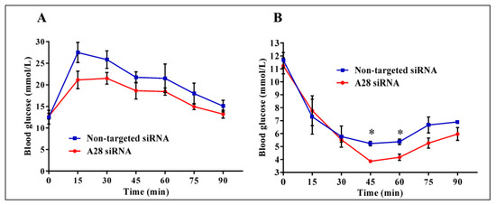 Metabolic testing in mice treated with ADAM28 siRNA. In vivo knock-down of ADAM28 reduces high fat diet-induced glucose intolerance (A), as demonstrated with glucose tolerance testing, and insulin resistance (B), as demonstrated with insulin tolerance testing in mice. * p < 0.05; (n = 3 mice/group).