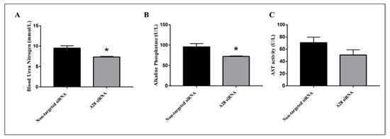 Metabolic benefits in mice treated with ADAM28 siRNA. Blood urea nitrogen (A); Alkaline Phosphatase (B); and aspartate aminotransferase (AST) activity (C). * p < 0.05; n = 3 mice/group.