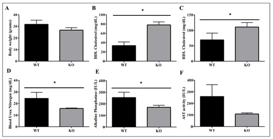 Metabolic benefits in female ADAM28 knock-out (KO) mice. Body weight at 10 months of age (A); High-density lipoprotein (HDL) cholesterol at 49 days of age (B); HDL cholesterol at 6 months of age (C); Blood urea nitrogen at 49 days of age (D); Alkaline Phosphatase at 49 days of age (E) and AST activity at 49 days of age (F). * p < 0.05; n = 3–4 mice/group.