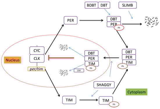 These feedback loops are both positive and negative, with positive factors (e.g., clock (CLK) and cycle (CYC)) producing transcription of negative factors (e.g., period (PER) and timeless (TIM)). The transcription factors CLK and CYC form a heterodimer that binds to the E-box in the per and tim promoters, thereby promoting transcription of these genes [,]. Cytoplasmic PER protein is phosphorylated by doubletime (DBT) and as a consequence becomes vulnerable to degradation [] due to the effects of the Slimb E3 ligase []. Bride of doubletime (BDBT) binds to DBT to stimulate its activity towards PER [], but TIM protein, which accumulates during the night, can bind with PER to constitute the PER/TIM/DBT complex, thereby preventing DBT-dependent PER degradation and stabilizing PER []. With the help of Shaggy [], the complex enters the nucleus in the second half of the night to suppress the function of the CLK/CYC heterodimer []. TIM is degraded in response to light due to a light-dependent interaction with an intracellular flavoprotein photoreceptor call cryptochrome (CRY). After TIM is degraded in the early morning by CRY in response to light [], DBT promotes the degradation of nuclear PER, and the CLK/CYC function is recovered, starting a new round of expression of per, tim and a large number of CLK/CYC-driven genes whose oscillations confer the outputs of the circadian clock (Figure 1). PER and TIM proteins oscillate in level out of phase with their respective RNAs, which peak in the early evening while nuclear PER and TIM proteins peak in late night and early morning. This unusual phase relationship is thought to be produced at least in part by the coupling of the transcriptional negative feedback loop with the post-translational effects of CRY, phosphatase and kinases like DBT, which delay that initial accumulation of PER and TIM until the per and tim mRNAs have reached their peak levels of expression. Subsequent transcriptional repression is produced by the delayed nuclear accumulation of PER and TIM, thereby producing the oscillations [].