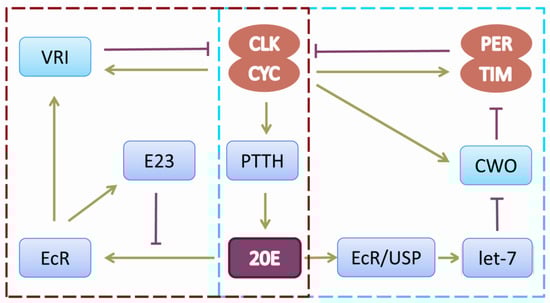 Ecdysone is amongst the best studied hormones in Drosophila and is well characterized with respect to its essential role in coordinating developmental transitions such as larval molting and metamorphosis []. Ecdysteroid biosynthesis and signaling are also active in adult insects, and we have reported that CLK-PTTH-ecdysone-ecdysone receptor (EcR)/ultraspiracle protein (USP)-mediated signaling contributes to circadian regulation []. CLK/CYC has a direct transcriptional effect on the expression of prothoracicotropic hormone (ptth), and the ptth transcriptional periodicity is correlated with ecdysteroid titer []. EcR/USP in circadian neurons receives ecdysone and binds to the endogenous let-7-C locus, thereby activating its transcription, and the miRNA let-7 affects the locomotor rhythm by suppressing the circadian-relevant target gene cwo in the central clock regulatory cycle. In addition, VRI also responds to ecdysone both in cell culture and in vivo []. Early gene at 23 (E23) and ecdysone form a feedback loop to tune a circadian oscillation, in which E23 is induced by ecdysone hormone, and its protein negatively regulates ecdysone-mediated vri expression []. These investigations highlight the role of ecdysone on circadian regulation (Figure 2). The circadian clock is a key driver of steroid hormone production in Drosophila []. Other hormones also have similar roles in the circadian system, such as juvenile hormones (JHs) and melatonin (N-acetyl-5-methoxytryp-tamine) (for the details, see the review []).