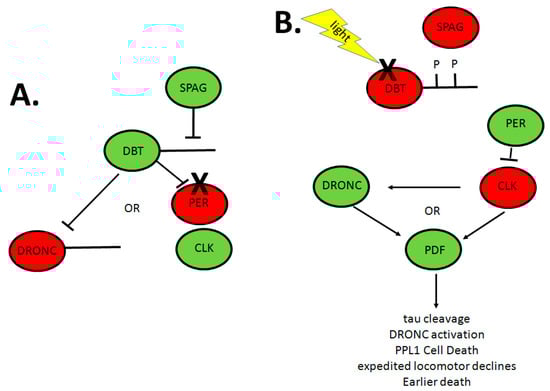 Hypothetical model for the PDF-dependent cell death/tauopathy pathway activated by reductions in DBT or CLK activity. Red proteins are in the inactive state and green proteins are in the active state. (A) In wild-type genotypes, SPAG associates with DBT to maintain it in the dephosphorylated state. DBT maintains the caspase DRONC in the inactive state and allows normal CLK activity via phosphorylation and degradation of PER; (B) With knock-down of SPAG, DBT autophosphorylates its C terminus and is degraded in response to light. This allows cleavage of DRONC to activate it and inactivation of CLK via accumulation of high levels of PER. A dominant negative DBT or inactive CLK mutation may likewise activate DRONC directly and/or via a PDF-dependent pathway. As a consequence, tau is cleaved, DRONC is activated, PPL1 neurons die, age-related locomotor declines are expedited and flies die sooner. Arrows represent positive action, and T-bars represent negative action. X indicates degradation. PDF, pigment dispersing factor; DBT, doubletime; CLK, clock; SPAG, spaghetti; PER, period; PPL1, posterior protocerebral lateral 1.