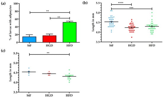 Effect of different diets on adipogenesis and growth of larvae. (a) Average percentage of larvae with adipocytes after feeding from 6–15 dpf with standard feed (StF), high glucose diet (HGD) or high fat diet (HFD); (b) Length (mm) distribution of larvae at 15 dpf. (StF: n = 32; HGD: n = 30; HFD: n = 33); (c) Length (mm) of larvae with adipocytes. (StF: n = 5; HGD: n = 6; HFD: n = 17) (** p ≤ 0.05, *** p ≤ 0.01, **** p ≤ 0.0001). Error bars represent Standard Deviation.