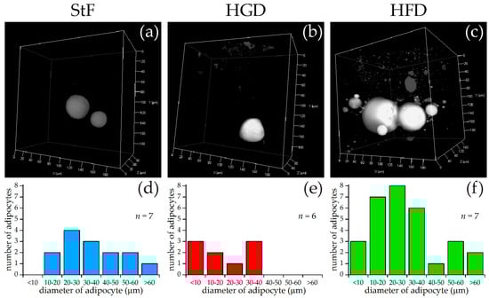In the StF group, larvae had on average 2.0 adipocytes per fish (n = 7), which was comparable to larvae from the HGD group that had on average 1.5 adipocytes per fish (n = 6). Larvae from the HFD group had on average 5.0 adipocytes per fish (n = 7). The intensity of the adipocyte SRS signal in the control diet group appeared to be lower than in the HFD group (Figure 3a vs. Figure 3c). Comparison of the sizes of the adipocytes showed that adipocytes from the HGD group were notably smaller than the other two diets, which was reflected in the total adipocyte volume per fish, which is 0.1–27 pL for the HGD group compared to 9–281 pL for the StF group and 13–308 pL for the HFD group. Though StF and HGD larvae showed a similar distribution of all sizes of adipocytes, the HFD group clearly had more adipocytes in all size ranges. An overview of all size and volume measurements can be found in Table S1.