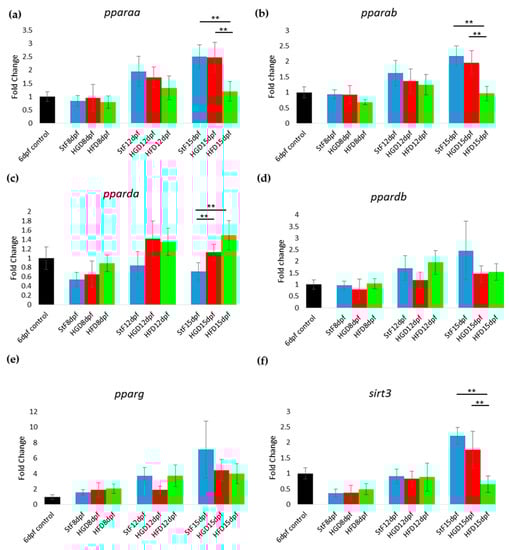 In zebrafish larvae on StF or HGD, the expression of most adipogenic markers increased in an age-dependent way, from 8 to 15 dpf (Figure 4). Larvae on HFD generally showed lower expression of adipogenic markers than StF or HGD (Figure 4). For example, at 15 dpf, mRNA expression of pparaa and pparab was significantly lower in larvae fed HFD compared to StF or HGD (Figure 4a,b). Interestingly, pparda was the only gene in the PPAR family that was significantly elevated after HFD at 15 dpf (Figure 4c). The expression of both ppardb and pparg was not significantly changed by different diets (Figure 4d,e). Expression of sirt3, a member of the sirtuin family, was also significantly lower in HFD larvae (Figure 4f).