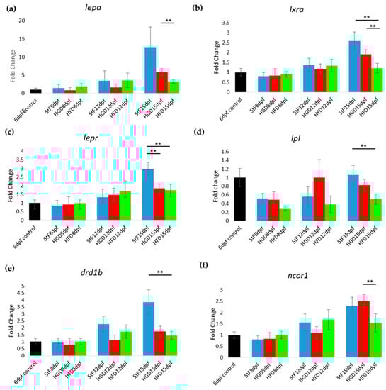 Furthermore, the expression of genes coding for receptors and hormones of the adipose tissue–gut-brain pathway such as lepa, lepr, lxra (nr1h3), lpl and drd1b was assessed. The expression of these genes increased with developmental stage in larvae fed with StF (Figure 5a–e). This age-dependent effect was not seen in HGD and HFD larvae, where expression levels of these genes were lower compared to StF. At 15 dpf, expression of lxra (nr1h3), lepr, lpl and drd1b, was significantly lower in HFD larvae relative to StF (Figure 5b–e). lepr was also significantly downregulated relative to StF in HGD larvae (Figure 5c). In both StF and HGD larvae, the expression of ncor1 was increased over time, a trend that was not observed in HFD larvae (Figure 5f).