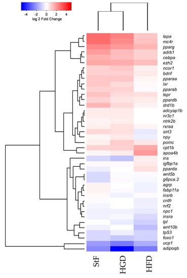 In addition to the analysis of specific genes at different time points during development, we performed gene expression analysis using an obesity array in larvae at 15 dpf. We investigated the differences in gene expression between the different diet groups using an overall comparison approach which is visualized in a heatmap by hierarchical clustering of gene expression (Figure 6). In general, this gene expression analysis showed that StF and HGD are closely related and have a similar expression pattern, although HGD larvae were shorter in length, suggesting no difference in development progression. HFD larvae, which were similar in length to HGD larvae, exhibited a distinct gene expression pattern, suggesting that diet, and not differences in developmental stage, affected gene expression. This analysis showed that a number of genes involved in adipogenesis pathway and Ppar signaling were activated in larvae from the StF and HGD diet groups, while in larvae fed with HFD showed reduced expression (Figure 6).