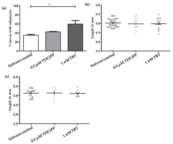 In a preliminary study, zebrafish embryos were exposed to a concentration range of the putative environmental obesogens TDCiPP and TBT from 0–6 dpf in order to identify a concentration that caused no phenotypical effect on development (Figure S2). We then selected one non-toxic concentration of TDCiPP (0.5 μM) and TBT (1 nM); embryos were exposed from 0–6 dpf to this concentration, and reared under a StF regime from 6–15 dpf. In the solvent control (0.01% DMSO) group, on average 35% of the larvae (n = 2 experiments) developed adipocytes at 15 dpf (Figure 7a). A similar percentage was observed after exposure to 0.5 µM TDCiPP (42%). After exposure to 1 nM TBT, the percentage of larvae that developed adipocytes was significantly increased relative to the solvent control (60%). We also measured the length of larvae at 15 dpf in the different groups but found no difference between treatments when considering all larvae (Figure 7b) or exclusively larvae with adipocytes (Figure 7c).