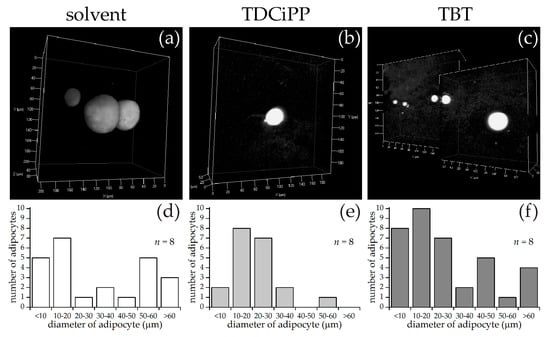SRS imaging of adipocytes in fish exposed to environmental chemicals. (a–c) Representative images of volumes of SRS lipid measurements following solvent control (0.01% DMSO), 0.5 µM TDCiPP, or 1 nM TBT exposure, respectively; (d–f) Frequency of adipocytes in different size classes of solvent control (n = 8), TDCiPP (n = 8) or TBT (n = 8) respectively, determined by an automated image processing algorithm in MATLAB.