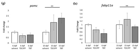 For gene expression analysis, larvae were analyzed either directly after exposure (6 dpf), or after maintaining the larvae on StF from 6 to 15 dpf. We analyzed the same genes using the obesity array as described earlier. Direct exposure to TDCiPP or TBT resulted in significantly increased expression the lepa gene relative to the solvent control at 6 dpf (Figure 9a). TDCiPP exposure resulted in significantly higher expression of lxr, pparda and drdb1 at 6 dpf (Figure 9b–d). fabp11a was the only gene that showed significantly lower expression after exposure to both TBT and TDCiPP (Figure 9e). The expression of wnt10b was significantly reduced in larvae exposed to TDCiPP at 6 dpf (Figure 9f). Gene expression changes of most of these genes was no longer changed when measured at 15 dpf. In general, most genes at 15 dpf were expressed at a level comparable to larvae from the control group, with the exception of drdb1 and pomc, which were significantly higher expressed in larvae exposed to TBT, and ucp1, which was significantly reduced after developmental TBT exposure (Figure 9d,g,h).