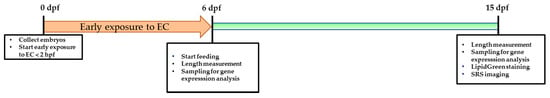 Schematic representation of the procedure used to analyze the effects of environmental chemicals (EC) on adipocyte development in zebrafish larvae.