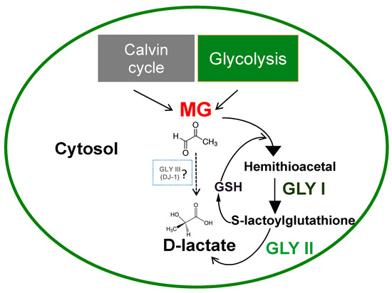 Reliable estimation of MG concentration is challenging and has been found to be highly variable based on the analytical method used. Measurement of methylglyoxal by stable isotopic dilution analysis LC-MS/MS and mathematical metabolic modeling has identified that MG concentration is in the range of 3–4 µM (nmol/g fresh weight) in plant tissues, which is comparable to the concentrations in animal tissues estimated by the same methodology [23]. Therefore, previously reported higher MG levels in plants could possibly be overestimates resulting from inappropriate assay methodology, where triosephosphates degrade to MG during sample processing. Light and dark cycles (diurnal cycles) also contribute to changes in the levels of MG-derived glycation adducts in plants. In Arabidopsis, MG-derived advanced glycation end-product (AGE) residues, Nε-caboxyethyl-lysine (CEL), and methylglyoxal–derived lysine dimer (MOLD) have been shown to display an oscillatory, diurnal behavior where maximal residual contents were observed in the middle of light and dark cycles [24]. Given the need to live with consistently high amounts of MG, plants have evolved an efficient system to eliminate this toxic compound and the harmful effects caused by it.