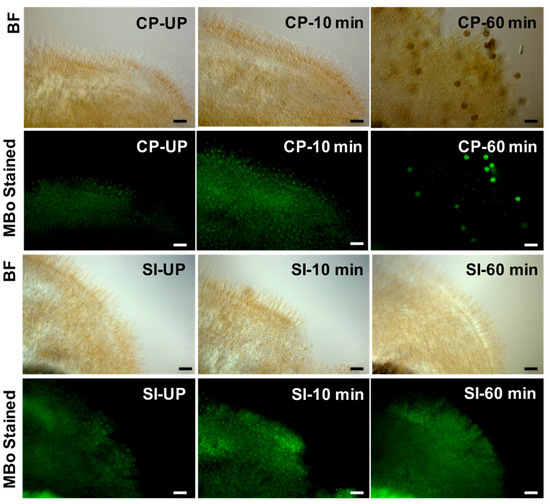 Visualization of MBo-stained papillary cells after 0, 10, and 60 min of pollination, suggesting an increase in MG levels after 10 min in both Westar (compatibly pollinated) and W1 (self-incompatible pollination), which decreases after 60 min of compatible pollination, but persists following self-incompatible pollination. (BF: bright field; CP: compatible pollination; SI: self-incompatible pollination; UP: unpollinated), scale bars = 50 µm.