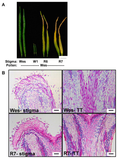 Loss of GLO1 results in increased damaged to the stylar transmitting tract and female reproductive tissue during pod development. (A) GLO1 suppressed lines (R6 and R7) showing tissue death phenotype that radiates down from the top of the stigma during pod development following compatible pollination; (B) Histological sections of pods of similar age from Wes and R7 line showing increased cell death in the vascular tissue and cells around the stigma and stylar transmitting tract (TT) in the absence of GLO1. Scale bars = 100 µm.