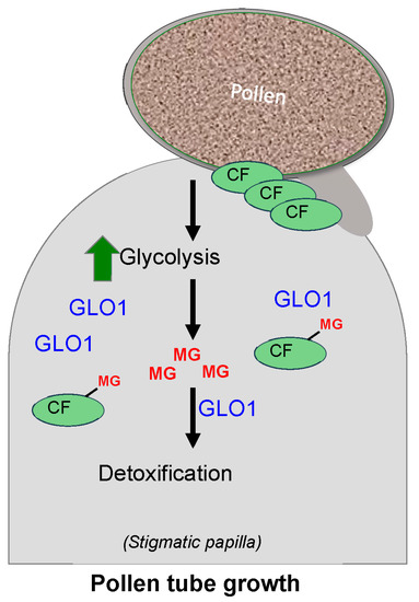 Detoxification of methylglyoxal (MG) by GLO1 ensures successful pollination. Landing of pollen on stigmatic papillae leads to increased glycolysis resulting in accumulation of toxic MG; MG can modify compatibility factors (CFs) to trigger their degradation. GLO1 protein levels are increased following compatible pollination, which results in rapid detoxification of MG, allowing CFs to be delivered to the site of pollen attachment, ensuring successful pollination.