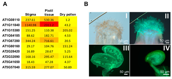 In Arabidopsis, expression analysis of glyoxalase I family members in reproductive tissues (stigma, pistil, and pollen) revealed a highly differential expression (Figure 5A). Methylglyoxal staining of Arabidopsis reproductive tissues with MBo revealed high levels of MG in pistils, anther, pollen, and the female gametophyte, suggesting the existence of differentially expressed glyoxalase family members in these tissues for MG detoxification (Figure 5B). Furthermore, pollination enhances the expression of BnGLO1-RFP (Brassica napus Glyoxalase I) in Arabidopsis stigmas (Figure 5C), reaffirming the essential role of glyoxalase in detoxifying MG during pollination.