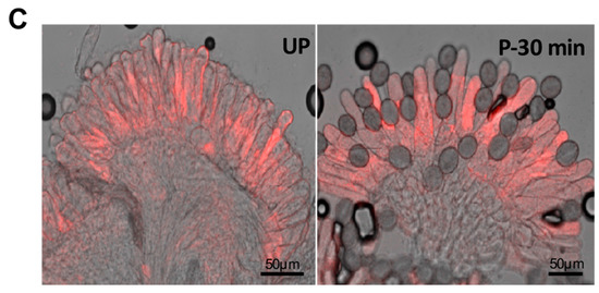 SI in Brassica (sporophytic self-incompatibility) results from an allele-specific interaction between the pollen encoded small cysteine-rich, secreted protein (SCR/SP11) and the stigmatic S-receptor kinase (SRK), which leads to the activation of Armadillo Repeat-Containing 1 (ARC1) E3 ubiquitin ligase, which targets compatibility factors needed for the successful pollination for proteasomal degradation [61,62,63,64,65]. In contrast, following compatible pollination (CP), the resources or compatibility factors are provided by the stigma to the dry pollen so that pollen tubes can germinate and penetrate the stigmatic cuticle for successful fertilization [66,67]. Using a DIGE (difference gel electrophoresis)-based proteomics assay, we had previously identified glyoxalase I (GLO1) as one of the major candidates downregulated following SI response in Brassica napus [68,69]. Functional analysis of the role of GLO1 during pollination using isogenic Brassica napus lines (self-compatible Westar and the self-incompatible W1) revealed that GLO1 activity is essential for compatible pollination to occur [60]. Biochemical assays to measure GLO1 activity and levels revealed a significant increase in GLO1 activity and levels following compatible pollinations (CP) within 60 min and a significant reduction in GLO1 activity and levels within 60 min after SI pollinations. When MG levels were determined in the stigmas using either a spectrophotometric approach or fluorescent imaging using a fluorescent sensor MBo (methyl diaminobenzene-BODIPY) [70] (see supplemental material), MG levels correlated with the GLO1 protein/activity following CP and SI. MG accumulation could be observed in W1 stigmas as early as 30–60 min of incompatible pollination, while after compatible pollination, MG levels rapidly increased around 10 min and returned to unpollinated levels by 60 min (Figure 2). The increase in MG levels in stigmas following landing of the pollen is probably the result of increased glycolysis to generate energy for supporting the growing pollen tube. The growth of the pollen tube through the female tissue can be compared to the growth of fungal hyphae in plant cells and in both cases, plant cells would experience some stress leading to MG accumulation. Although MBo was previously studied in detail both in vitro and in eukaryotic cells [66], this is the first application of MBo in plants. Therefore, fluorescence due to interactions with non-MGO metabolites cannot be precluded, and all interpretations arising from MBo studies must be asserted with this caveat in mind.