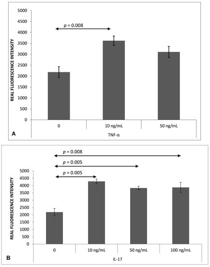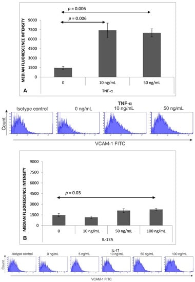 Significantly greater VCAM-1 expression was observed in brain endothelial cells after stimulation with TNF-α (10 ng/mL, p = 0.006 and 50 ng/mL, p = 0.006) (Figure 2A). Expression of VCAM-1 was also upregulated on bEnd.3 cells stimulated with IL-17 (100 ng/mL; p = 0.03) (Figure 2B).