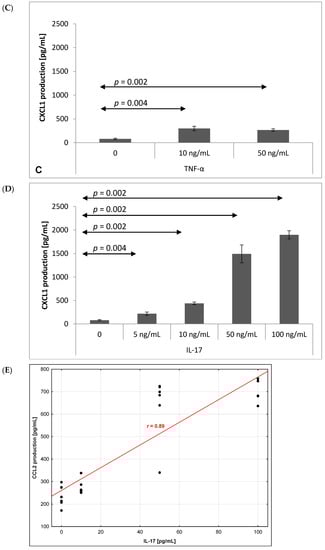 CXCL1 belongs to the family of CXC chemokines, which are known for their ability to attract neutrophils. IL-17 has been found to stabilize mRNA for CXCL1, thus increasing its half-life []. A number of studies have demonstrated CXCL1 secretion from epithelial and mesodermal cells, but little is known about its production by the endothelium. Recently, Makito et al. described CXCL1 production in an autocrine manner by human endothelial cells and its role in angiogenesis []. CXCL1 production is also known to be enhanced by inflammatory cytokines such as TNF-α and IL-1β in human endothelial cells [].