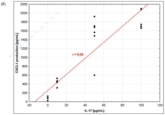 CCL2 (A,B) and CXCL1 (C,D) chemokines production by mouse brain endothelial cell line (bEnd.3) after 4 h of stimulation with TNF-α (A,C) or IL-17 (B,D). Production was measured as described in Materials and Methods. Data expressed as mean ± SEM. Correlation between IL-17 stimulation and production of CCL2 (E) or CXCL1 (F) by brain endothelium. Underlined r values are considered statistically significant (Pearson’s test, p < 0.05); n = 6 for the numbers of performed experiments.