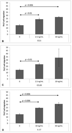 Chemokines CCL2 (2.5 ng/mL, p = 0.01; 10 ng/mL, p = 0.01) (Figure 4A), CCL5 (2.5 ng/mL, p = 0.01; 10 ng/mL, p = 0.006) (Figure 4B), CCL20 (2.5 ng/mL, p = 0.01) (Figure 4C) or IL-17 (10 ng/mL, p = 0.006; 50 ng/mL, p = 0.006) (Figure 4D) significantly stimulated Th17 cell transmigration through the bEnd.3 monolayer.
