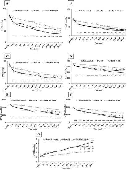 Effect of kaempferol on (A) systolic arterial pressure (SAP); (B) mean arterial pressure (MAP); (C) diastolic arterial pressure (DAP); (D) heart rate (HR); (E) maximal positive rate of the left ventricular pressure (+LVdP/dtmax); (F) maximal negative rate of the left ventricular pressure (−LVdP/dtmax) and (G) left ventricular end diastolic pressure (LVEDP). Data are expressed as the mean ± S.E.M.; n = 6 in each group. * p < 0.05, ** p < 0.01, *** p < 0.001 vs. Diabetic control; # p < 0.05, ## p < 0.01 vs. Dia + IR.