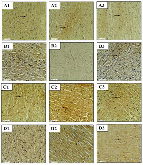 Effect of kaempferol on (A1–A3) Bax immunohistochemistry; (B1–B3) Bcl-2 immunohistochemistry; (C1–C3) Caspase-3 immunohistochemistry; (D1–D3) TUNEL assay. (A1–D1) diabetic control; (A2–D2) diabetes + ischemia-reperfusion and (A3–D3) diabetes + kaempferol 20 mg/kg + ischemia-reperfusion; n = 3 in each group; 20×; scale bar 100 μm; (→): positive stain.