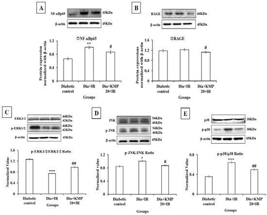 Effect of kaempferol on (A) NF-κBp65; (B) RAGE; (C) ERK1/2, p-ERK1/2; (D) JNK, p-JNK; (E) p38, p-p38. Protein expressions are normalized with β-actin. All the values are expressed as mean ± S.E.M.; n = 3 in each group. * p < 0.05; ** p < 0.01, *** p < 0.001 vs. diabetic control; # p < 0.05; ## p < 0.01 vs. Dia + IR.