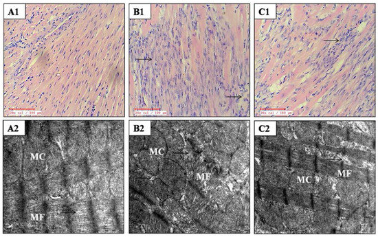 Effect of kaempferol on light microscopy (20×; n = 3 in each group) and electron microscopy (scale bar: 1 µm; n = 3 in each group). (A1,A2) diabetic control; (B1,B2) diabetes + ischemia-reperfusion and (C1,C2) diabetes + kaempferol 20 mg/kg + ischemia-reperfusion; MF: myofibrils; MC: mitochondria; (→): myocyte damage.