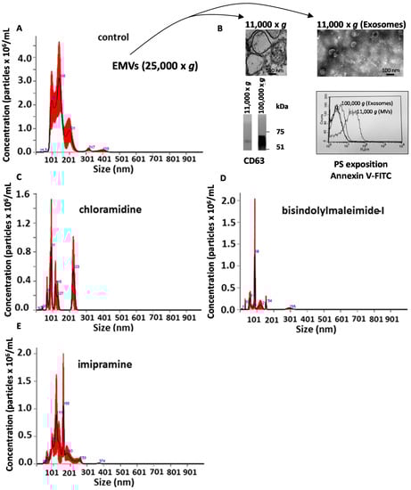 Nanoparticle tracking analysis (NTA) of exosomes and microvesicles (EMVs) released from PC3 cells in the presence of a range of EMV inhibitors. Plots presenting NTA analysis show the concentration of vesicles (0–900 nm in diameter) released from PC3 cells in the absence of any EMV inhibitors (A); In (B) the EMVs are shown to comprise exosomes and microvesicles (MVs) by electron microscopy, by Western blotting (for CD63 expression), and by the degree of phosphatidylserine (PS) exposition. NTA analysis for released EMVs from PC3 cells are presented in the presence of Cl-amidine (C); bisindolylmaleimide-I (D); and imipramine (E). Vesicles outside the size range of 0–900 nm were excluded to avoid including larger vesicles such as MV aggregates or apoptotic bodies. The experiment was repeated three times in total (error bars ± SEM, indicated in red).