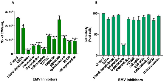Pharmacological inhibition of EMV release from PC3 cells is highest with Cl-amidine, bisindolylmaleimide-I, and imipramine. (A) Using NTA, the most significant inhibition of EMV release from PC3 cells after 24 h was observed in the presence of Cl-amidine, bisindolylmaleimide-I, and imipramine. After 24 h, none of the inhibitors caused any significant reduction in cell viability, (B) except for d-pantethine. The experiments were repeated three times, and the data presented are mean ± SEM of the results. (* p ≤ 0.05; **** p ≤ 0.0001).