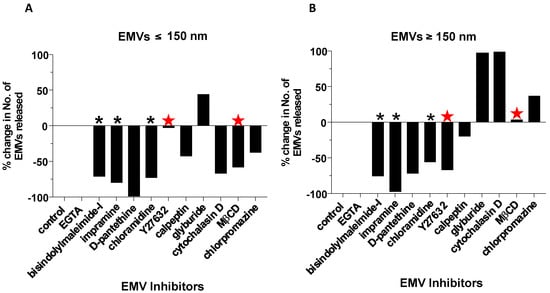 Size exclusion analysis of the NTA data, considering vesicles ≤150 nm (A) or ≥150 nm (B), indicates percentage changes in number of exosome-sized vesicles (A) versus MV-sized vesicles (B) respectively. MβCD, which only reduced exosome-sized vesicles (≤150 nm), and Y27632, which only reduced MV-sized vesicles (≥150 nm), are both indicated by red stars. Cl-amidine, bisindolylmaleimide-I, and imipramine, which inhibited both exosome-sized and MV-sized vesicles, are indicated by black asterisks.