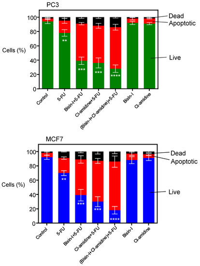 Cl-amidine and bisindolylmaleimide-1-mediated inhibition of EMV release increases the apoptosis of PC3 and MCF-7 cells treated with 5-FU. The Guava Viacount Cell Death Assay shows that PC3 and MCF-7 cells that were given 5-FU together with Cl-amidine, bisindolylmaleimide-I, or with a combination of Cl-amidine and bisindolylmaleimide-I, had significantly reduced levels of cell viability within 24 h compared to PC3 and MCF-7 cells receiving no EMV inhibitors and given only 5-FU. Bisindolylmaleimide-I and Cl-amidine had no significant effect on cell viability on their own. Data presented are the mean ± SEM of three independent experiments performed in triplicate (** p ≤ 0.01; *** p ≤ 0.001; **** p ≤ 0.0001 were considered statistically significant compared to the drug-treated control in the absence of inhibitors).