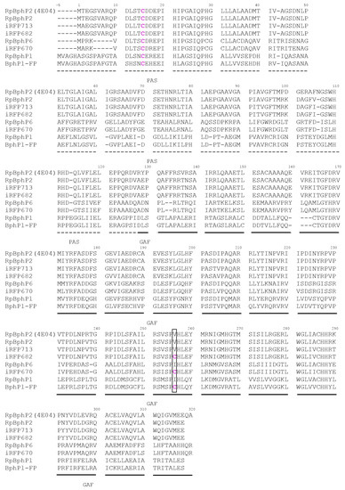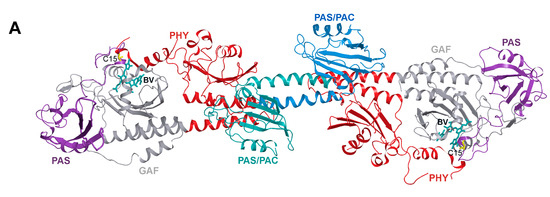 BphPs are involved in light regulation of motility and pigment synthesis [6,7,8,9,10]. To sense the light BphPs utilize as a chromophore a heme-derived linear tetrapyrrole, biliverdin IXα (BV) [11]. BphPs are reversibly switched by far-red and NIR illumination between two stable states that absorb at 680–710 nm (the Pr state) and 740–760 nm (the Pfr state). Canonical BphPs have the ground Pr state while BphPs termed as bathy phytochromes have the ground Pfr state [10,12,13,14,15]. BphPs are multi-domain proteins composed of a photosensory core module (PCM) and an output effector module. The PCM can be separated into the chromophore-binding domain (CBD), which is minimally required for chromophore binding and PHY (phytochrome-specific) domain, which is implicated in photoconversion of the chromophore between Pr and Pfr states and signal propagation to the effector module. The CBD part consists of the PAS (Per-ARNT-Sim repeats) domain and the GAF (cGMP phosphodiesterase/adenylate cyclase/FhlA transcriptional activator) domains. In the N-terminal extension of the PAS domain of BphPs there is the conservative Cys residue (Cys15), which binds the ligand through a thioether bond, while the GAF domain forms a pocket, which is able to hold BV [16,17]. The output effector modules of the most of BphPs are histidine kinases (HKs) [8,11,15]. Some BphPs possess a GGDEF/EAL domain [18,19] involved in second messenger signaling and the others possess a PAS/PAC domain involved in protein-protein interactions [10,12].