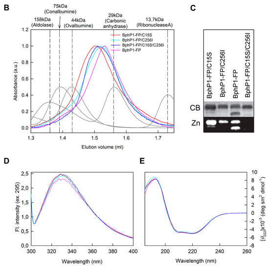 Characterization of BphPl-FP and its variants with different location of Cys residues. (A) Dimeric structure of RpBphP1-N70 without C-terminal HOS domain (PDB [31] ID: 4GW9 [30]). The graphic software VMD [32] and Raster3D [33] was used for drawing. Separate domains of RpBphP1-N70 monomer are differently colored; (B) Gel filtration of BphPl-FP, BphPl-FP/C15S, BphPl-FP/C256I and BphPl-FP/C15S/C256I proteins. The elution profiles of the proteins with known molecular mass used for the column calibration are shown in gray; (C) Covalent binding of biliverdin (BV) to proteins analyzed by sodium dodecyl sulfate polyacrylamide gel electrophoresis (SDS-PACE) followed by staining with Coomassie blue (CB) or by zinc-induced fluorescence of BV (Zn2+); (D) Tertiary structure of proteins tested using Trp fluorescence; (E) Secondary structure of BphPl-FP variants tested using far circular dichroism (CD) spectra.