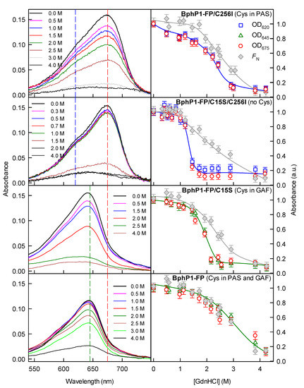 The protein unfolding was initiated by mixing 50 µL of the native protein with 500 µL of a buffer solution containing the desired concentration of GdnHCl (Sigma-Aldrich, St. Louis, MO, USA). The concentration of the stock GdnHCl solution was determined by the refraction coefficient. The dependences of the chromophore absorbance, fluorescence and ellipticity at 222 nm on the GdnHCl concentration for the BphP1-FP and its variants were recorded at 23 °C after protein incubation in a solution of an appropriate denaturant concentration at 23 °С for 24 h. Further increases in the equilibration time did not result in noticeable changes in the detected characteristics. The recorded fluorescence intensity was corrected for the primary inner filter effect according to the approach in [43,44].