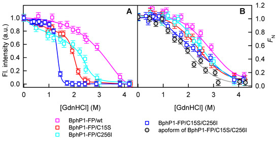 Stability of BphPl-FP and its variants in the holoform state against GdnHCl denaturation. (A) Changes in chromophore fluorescence intensity corrected to the total absorbance of the solution at the excitation wavelength, as described in “Materials and methods” section, are shown. Fluorescence was excited at 645 nm and recorded at 670 nm for BphPl-FP (pink squares) and BphPl-FP/C15S (red squares). Fluorescence was excited at 675 nm and recorded at 710 nm for BphPl-FP/C256I (cyan squares) and BphPl-FP/C15S/C256I (blue squares); (B) Dependences of the part of native molecules FN on the GdnHCl concentration calculated from ellipticity at 222 nm. Data for BphPl-FP/C15S/C256I in apoform are also shown (solid gray circles).