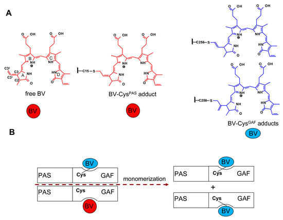 Scheme of the inter-monomeric effects in dimeric and monomeric NIR FPs. (A) Chemical structures of BV chromophores; (B) In dimeric NIR FPs inter-monomeric allosteric influence on the BV interaction with the protein results in covalent binding of BV only with one monomer of dimmer (the case of NIR FPs with Cys GAF only is shown). Monomeric BphP1-FP variants contained only covalently bound chromophore.